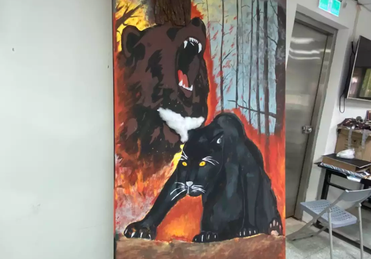 黑熊畫成正在咆哮的樣子來表示森林的怒吼